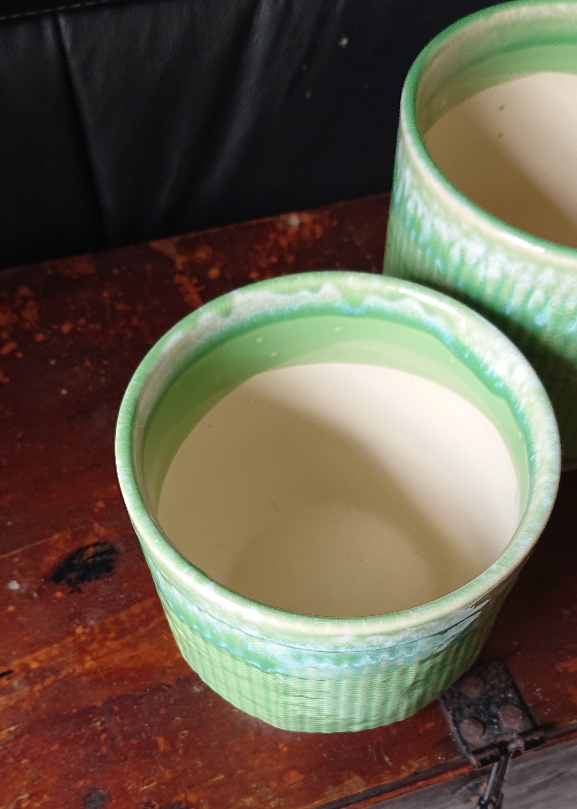 Green Glazed pot with Blue Glaze around, and dripping down the rim of the pot. Gloss finish with textured design. Each has its own perfect imperfections.