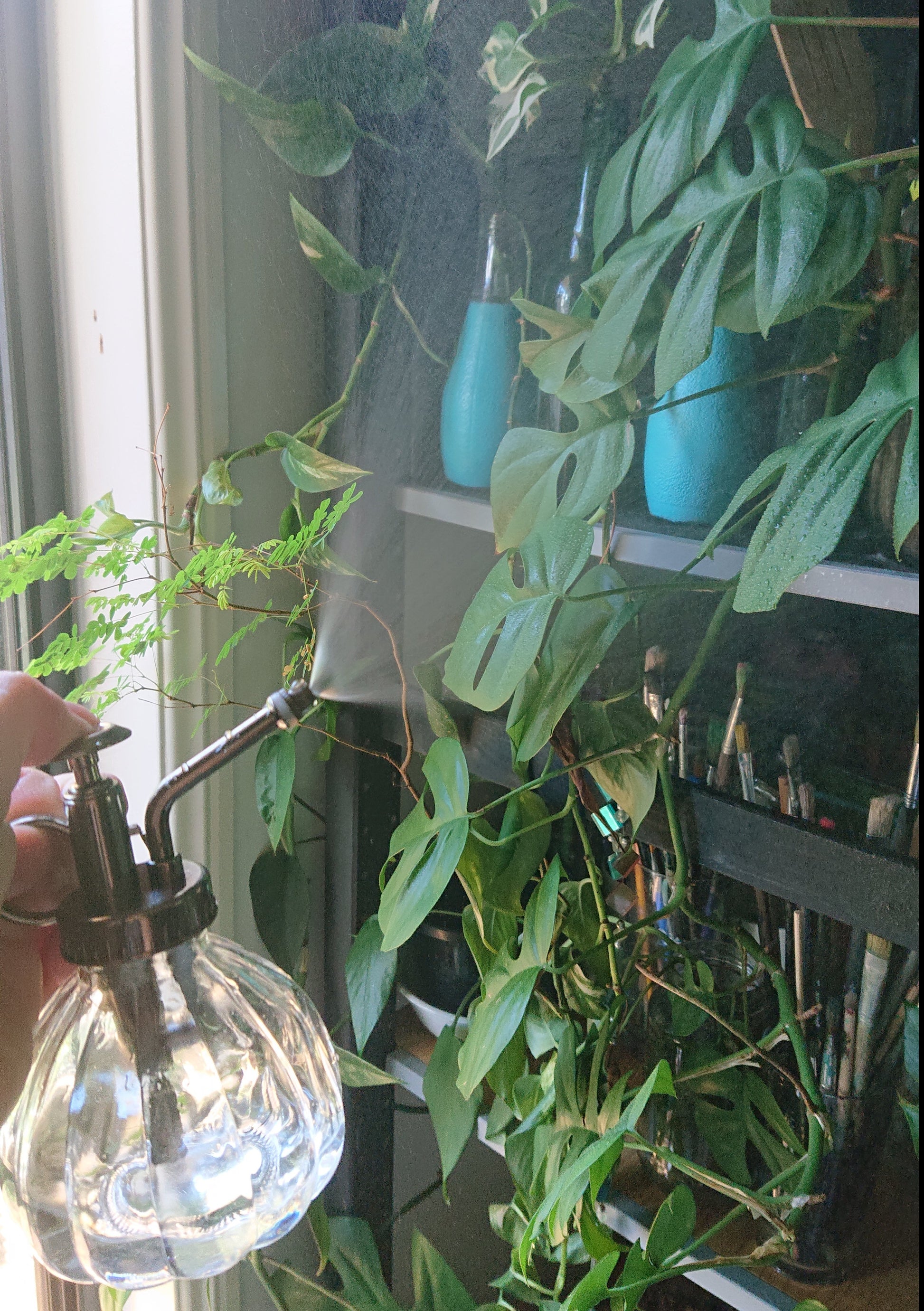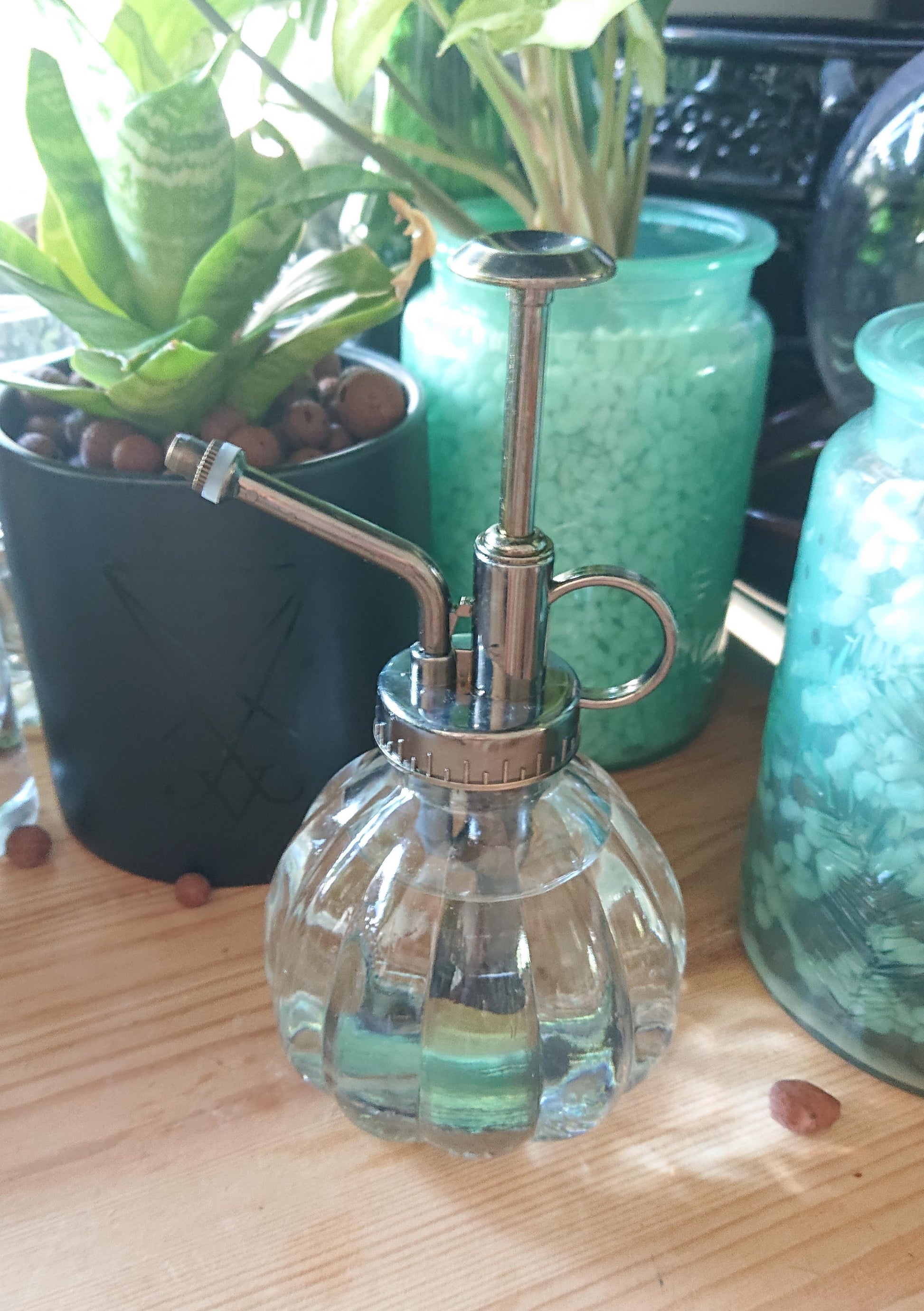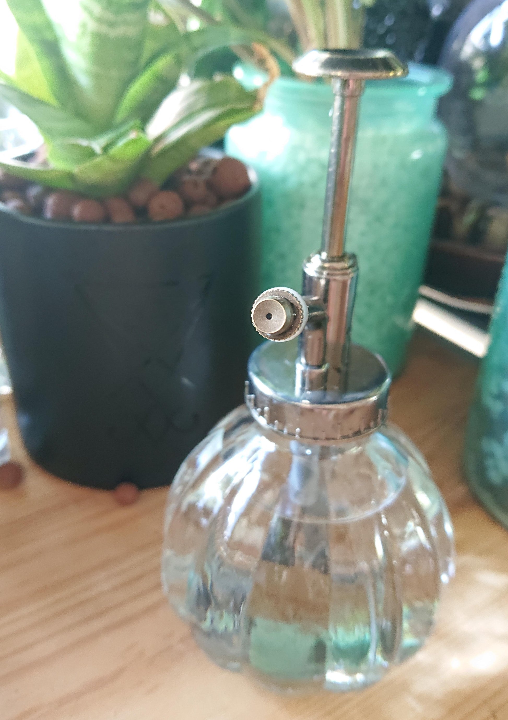 This lil fella mists like a dream! No drips or drizzles! Th Glass vessel holds 200mls. its 16cm high, so it fits perfectly in one hand without being heavy on your wrist.